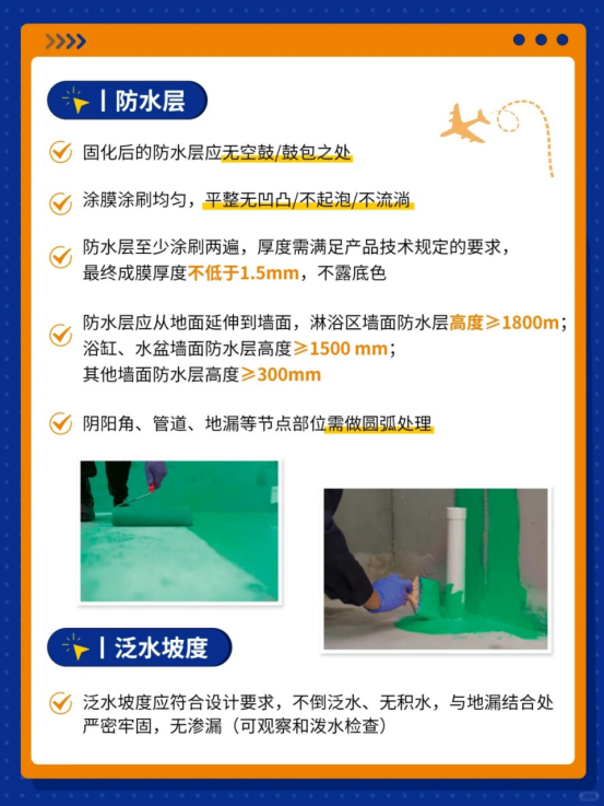 √防水层应从地面延伸到墙面,淋浴区墙面防水层高度≥1800m;浴缸、水盆墙面防水层高度≥1500 mm;其他墙面防水层高度≥300mm