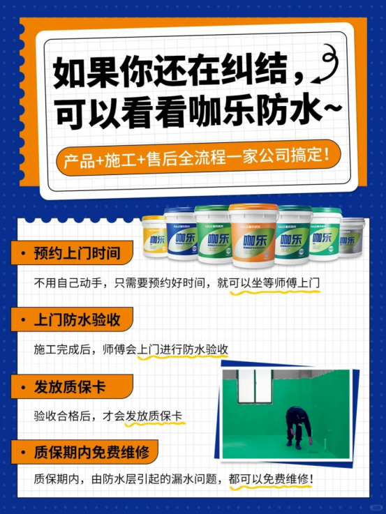 如果你纠结选什么防水材料、选哪家防水施工公司以及后续的防水验收怎么做,可以看看咖乐防水,产品+施工+售后全流程一家公司搞定,便利省心!